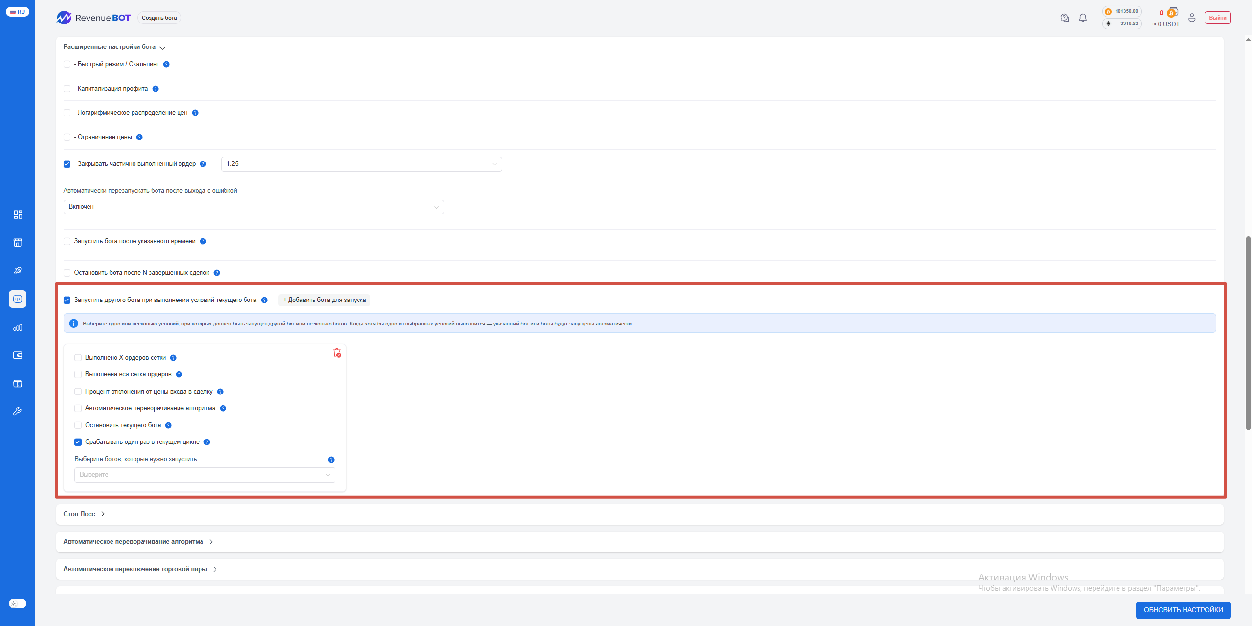 Когда хотя бы одно из выбранных условий выполняется — указанный бот (или несколько ботов) запускается автоматически.
